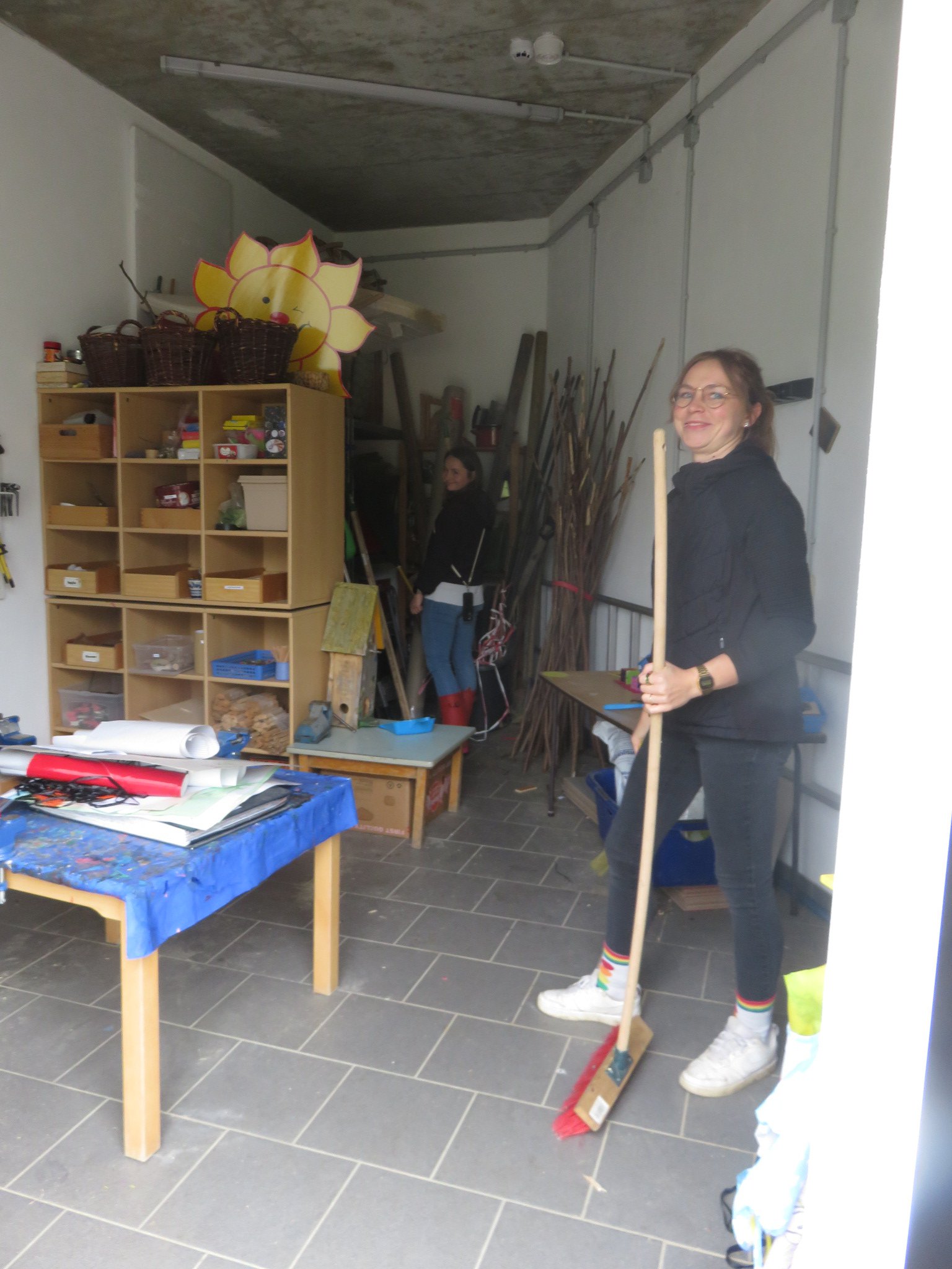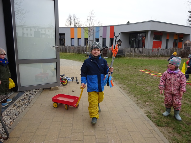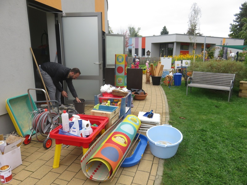 Im Garten werden neue Brommbeeren eingepflanzt. Es entstehen 2 Musiktore, kaputtes Spielzeug wird aussortiert und repariert, Schuppen werden gründlich ausgefegt und aufgeräumt.