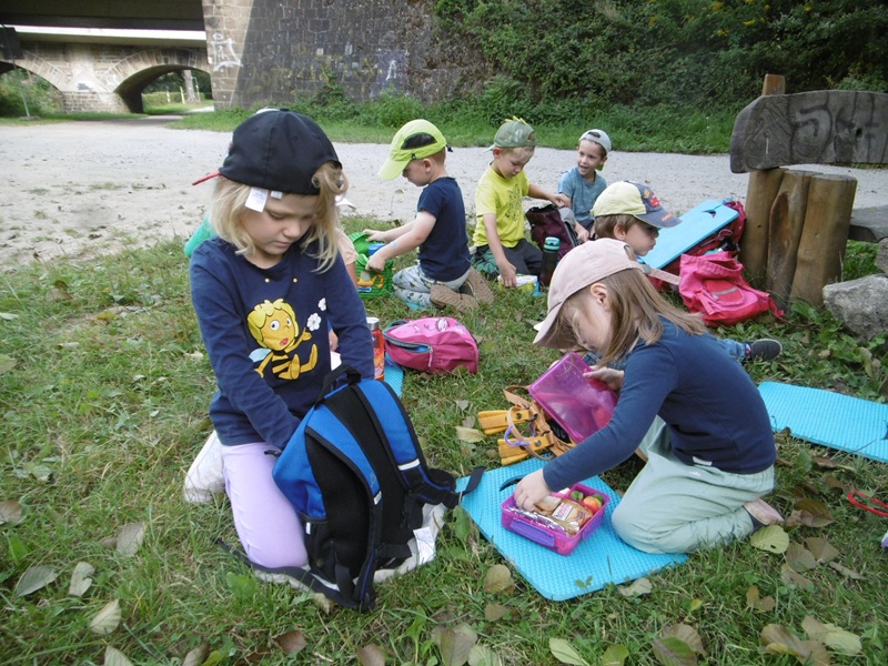 Bis wir dort ankommen, gibt es unterwegs schon ganz viel zu entdecken. Im Wald wird dann gebaut, gespielt und kleine Tiere werden beobachtet. Natürlich gibt es auch ein paar Pausen zum Verschnaufen. Dabei werden dann, die von den Eltern liebevoll gepackten Rucksäcke mit Snacks und Getränken geöffnet und tüchtig gegessen und getrunken.