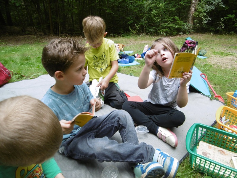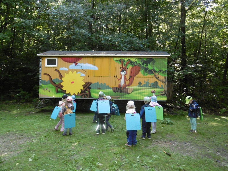 Seit dem 1. Mai sind die Vorschul- und Mittelgruppenkinder immer einen Tag in der Woche im Schiebocker Stadtwald unterwegs. Unser Waldwagen, der vom Verein organisiert und ausgebaut wurde, steht an der Waldbühne.
