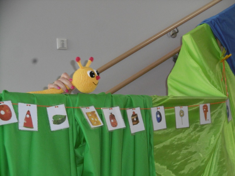 Nach dem „Sonnenscheintreff“ hören die Kinder im „Lesezelt“ der Familienbildungsstätte Bischofswerda(Das ist wie durch Zauberhand in unserem Garten.) die Geschichte der Raupe Nimmersatt. Alle Kinder lauschen gespannt der Geschichte. Jedes Kind darf sich einen Kokon, der im Zelt an den Wänden hängt, pflücken. Heraus kommt ein Schmetterling, welchen sie individuell gestalten können. Dann fliegen viele Schmetterlinge durch Haus und Garten. Zur Stärkung gib es für alle ein Eis.