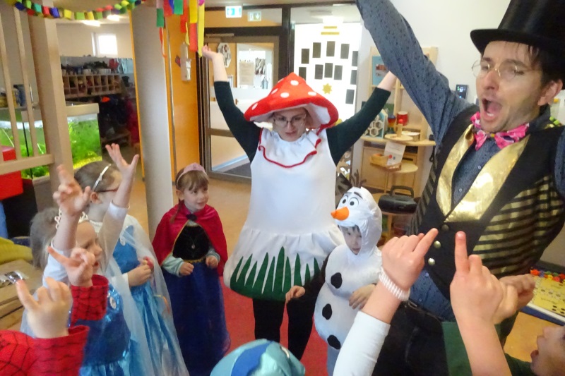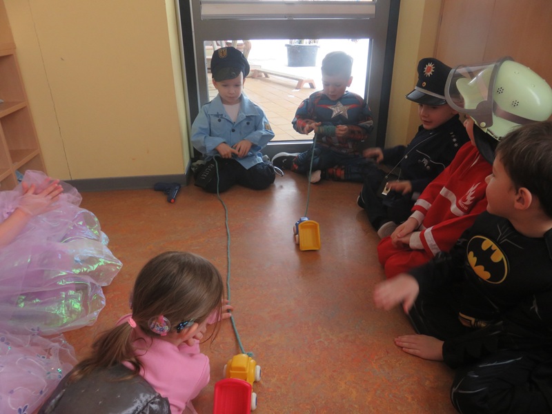 Nachdem alle satt sind, treffen wir uns zum Vorstellungskreis. Es gibt Prinzessinnen, Elsa`s, Superhelden, viele Tiere, Polizisten, Feuerwehrmänner, sogar Einhörner und viele mehr. Dabei wird gesungen, geklatscht und getanzt.