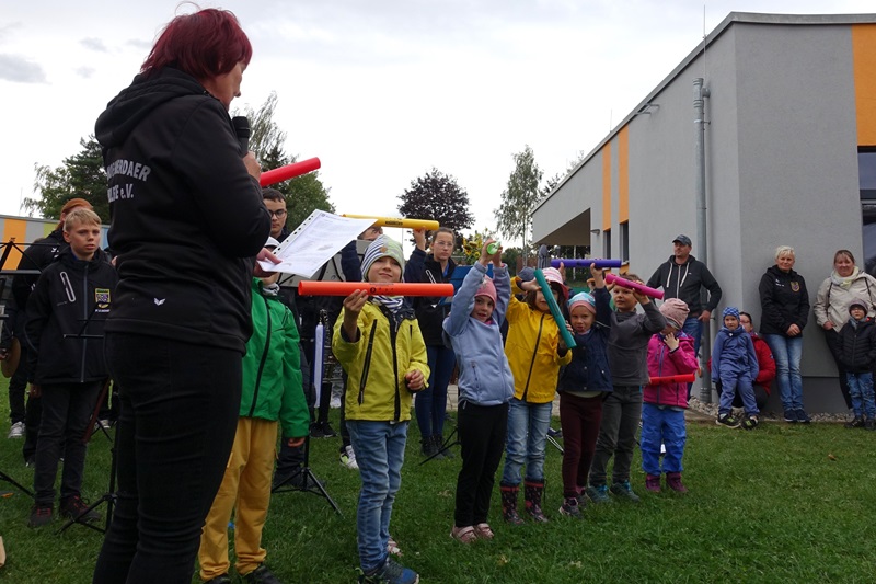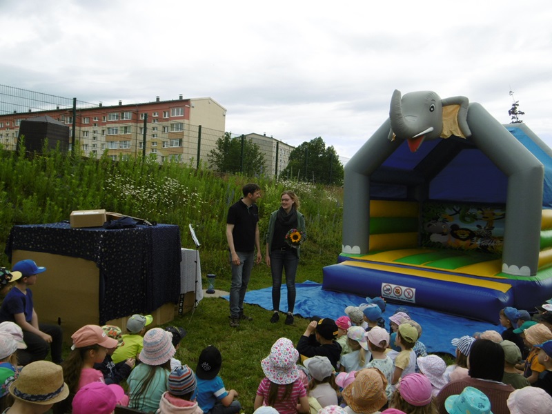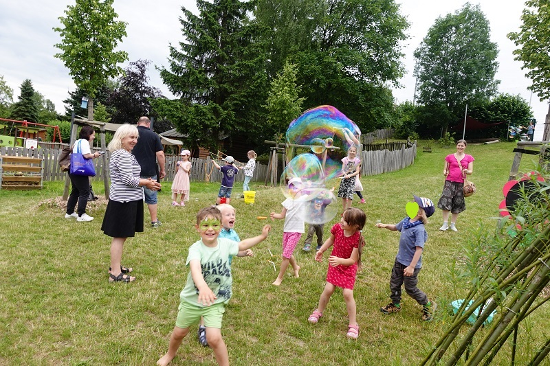Am 02.07.2022 war es so weit: Endlich konnte wieder Sommerfest gefeiert werden! Bei herrlichem Sonnenschein fanden viele große wie kleine Besucher den Weg ins Kinderhaus. Dort erwarteten sie Miniatur-Eisenbahnrundfahrt, Riesenseifenblasen-Station, Flohmarkt, Tombola, leckere Essstände u.a.m. Nach der musikalischen Eröffnung mit dem Lied zum diesjährigen Motto „So bunt so schön ist unsere Welt“ war ein Programmpunkt die feierliche Übergabe von 1000€, die der Förderverein des Kinderhauses aus der Town & Country Stiftung erhalten hat. Dieser Stiftungspreis wird seit acht Jahren an Organisationen und Einrichtungen vergeben, die sich für sozial benachteiligte Kinder und Jugendliche einsetzen. Vielen Dank hierfür an Herrn Marco Scholz, der uns über diese Möglichkeit informierte. Im Anschluss erfuhr die Lebensleistung der langjährigen Leiterin des Kinderhauses, Frau Andrea Eckert, eine Würdigung. Mit den Dankesworten von unserem Oberbürgermeister Holm Große wie von der neuen Leiterin des Hauses, Josephine Henke, wurde Andrea Eckert aus dem aktiven Dienst für das Kinderhaus verabschiedet. Mit einem Abschiedslied bedankte sich auch das Erzieherteam bei ihr, verbunden mit der Bitte, dass sie noch möglichst lange als Beraterin dem Kinderhaus verbunden bleibt. Einen weiteren Höhepunkt fand der Nachmittag dann noch in der Aufführung des Theaterstücks „Rumpelstielzchen“, humorvoll abgewandelt und einstudiert von Eltern, Erziehern und Kindern.