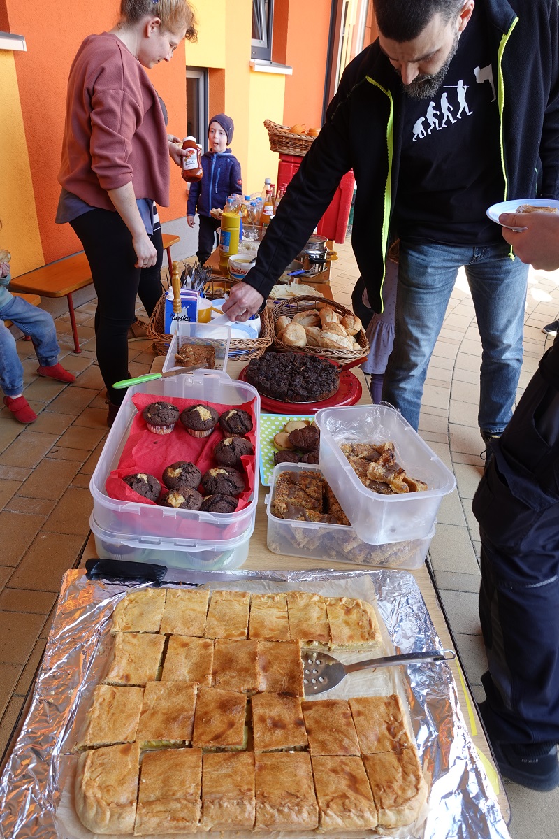 Der Tag startet mit einem Frühstücksbuffet, welches alle Eltern gemeinsam für die Kinder vorbereitet haben. Die Eltern haben etwas Gesundes, Lustiges oder Gebackenes mitgebracht. Dabei wurde darauf geachtet, dass nicht so viel Zucker enthalten ist.
