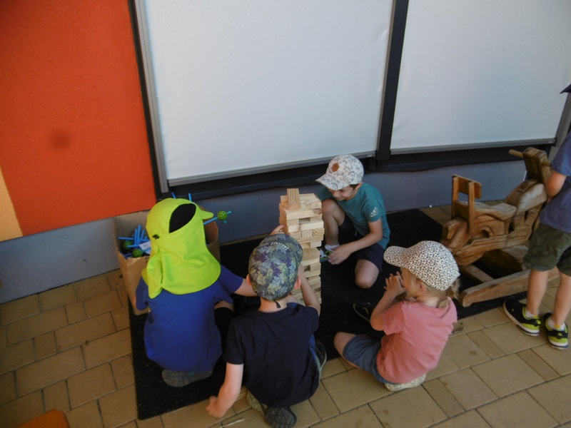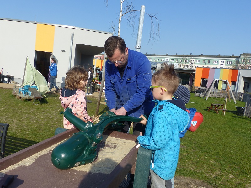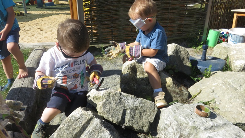 Im Garten werden neue Brommbeeren eingepflanzt. Es entstehen 2 Musiktore, kaputtes Spielzeug wird aussortiert und repariert, Schuppen werden gründlich ausgefegt und aufgeräumt.