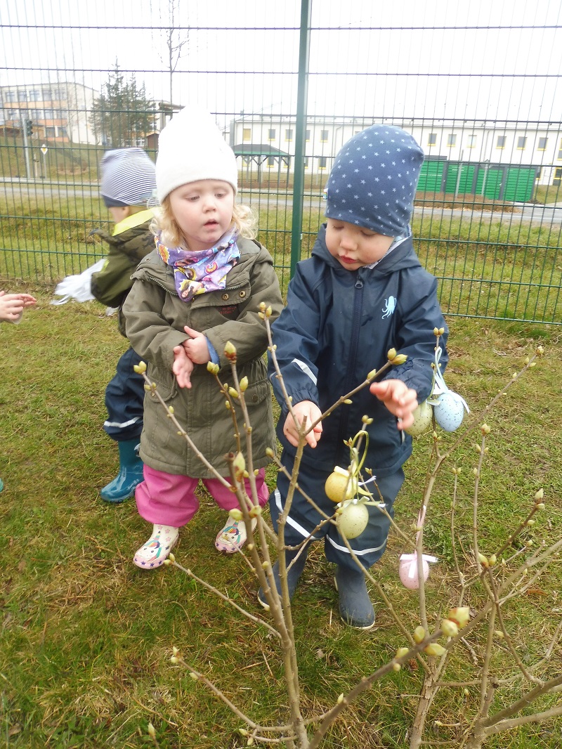Nach einem schönen Osterprogamm, welches von den Kindern der einzelnen Gruppen für alle Kinder im Haus aufgeführt wurde, waren im Garten viele Osternester versteckt. Jedes Kind hat ein Nest gefunden.
