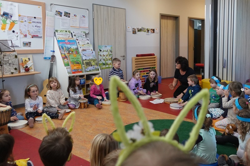 tragen Lieder, Fingerspiele und eine Klanggeschichte vor. Dann geht es in den Garten, um Osternester zu suchen. Wir finden kleine Osterhasen- Handpuppen mit einer echten Möhre in den Händen. Danke lieber Osterhase für diesen Osterspaß.
