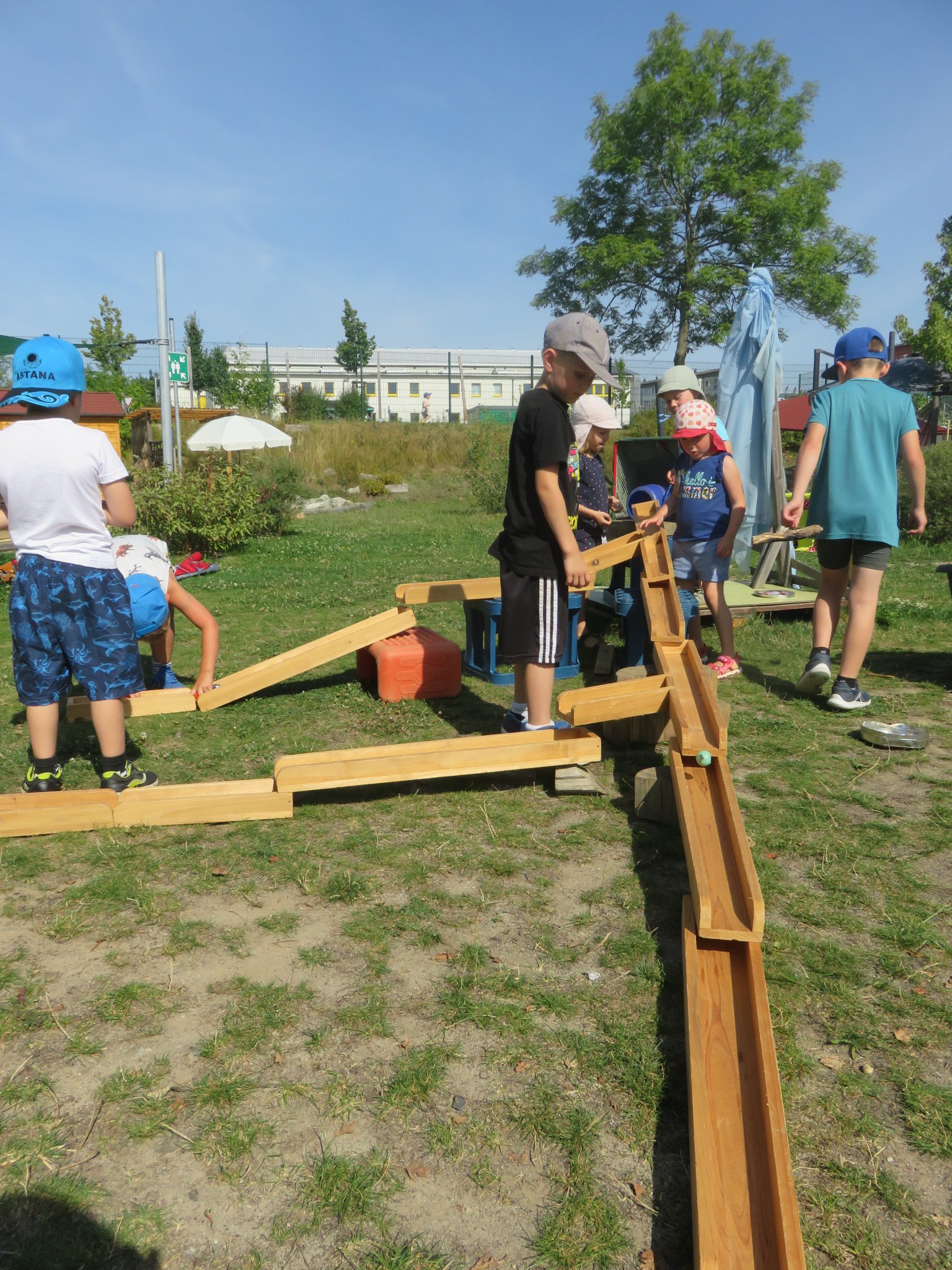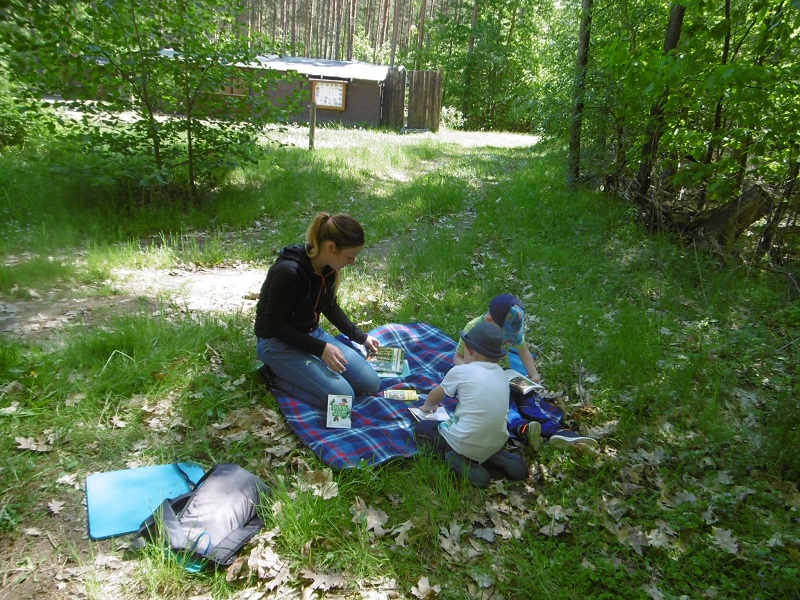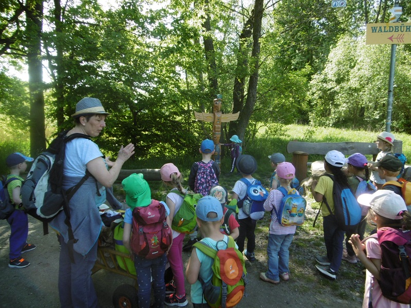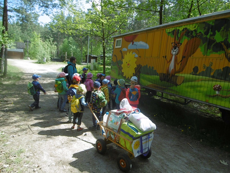 Seit dem 1. Mai sind die Vorschul- und Mittelgruppenkinder immer einen Tag in der Woche im Schiebocker Stadtwald unterwegs. Unser Waldwagen, der vom Verein organisiert und ausgebaut wurde, steht an der Waldbühne.