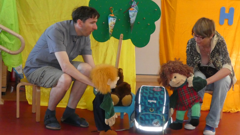 Jan und Sabine spielen uns mit „Lilli“ und „Rudi“ eine Geschichte zum Schulanfang vor.